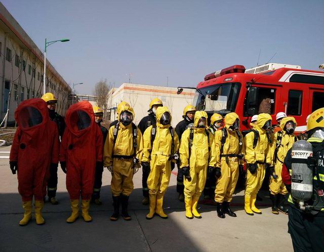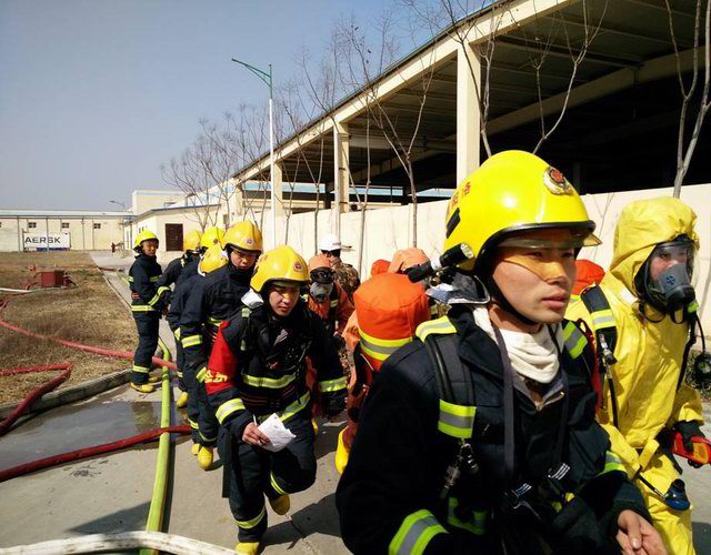 洛陽(yáng)市消防支隊(duì)王榮范參謀長(zhǎng)、西工區(qū)消防大隊(duì)劉學(xué)康大隊(duì)長(zhǎng)及洛陽(yáng)正大總裁辦喬光斌總經(jīng)理、食品事業(yè)部杜光輝副總經(jīng)理一行在演練前到達(dá)演練場(chǎng)地進(jìn)行安排部署,成立了消防演練現(xiàn)場(chǎng)指揮部,由洛陽(yáng)市消防支隊(duì)王榮范參謀長(zhǎng)任指揮長(zhǎng)。演練假設(shè)正大食品有限公司制冷機(jī)房因設(shè)備發(fā)生故障,液氨罐發(fā)生泄漏,1名操作人員受困,現(xiàn)場(chǎng)人員立即向公司領(lǐng)導(dǎo)匯報(bào)并撥打119尋求支援。119指揮中心在接到報(bào)警后,由洛陽(yáng)市消防支隊(duì)協(xié)調(diào),迅速調(diào)集澗西消防大隊(duì)下屬谷水中隊(duì),西工區(qū)消防大隊(duì)下屬車站中隊(duì)、紅山中隊(duì)迅速趕赴現(xiàn)場(chǎng),與此同時(shí)正大食品有限公司迅速啟動(dòng)單位應(yīng)急預(yù)案,組織員工疏散。十五分鐘后,紅山消防中隊(duì)6臺(tái)消防車、2臺(tái)救護(hù)車到達(dá)現(xiàn)場(chǎng),消防戰(zhàn)士著防化服立即進(jìn)入現(xiàn)場(chǎng),對(duì)氨中毒人員進(jìn)行搶救,對(duì)氨泄漏部位進(jìn)行應(yīng)急處置。二十分鐘后谷水中隊(duì)、車站中隊(duì)6臺(tái)消防車達(dá)到現(xiàn)場(chǎng)支援, 50余名消防員展開救援戰(zhàn)斗,用消防水槍噴水中和泄漏的氨氣,降低空氣中氨的濃度。經(jīng)過(guò)近一個(gè)小時(shí)的搶維修,氨泄漏得到控制,演練指揮中心宣布本次演練***結(jié)束。