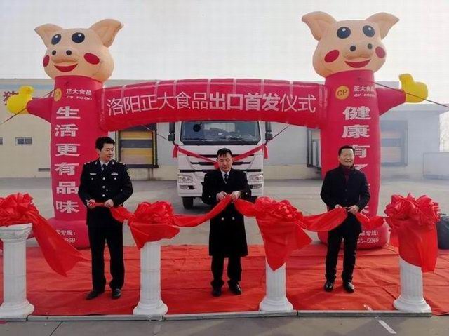 河南出入境檢驗(yàn)檢疫局認(rèn)證處副處長郭啟祥、洛陽出入境檢驗(yàn)檢疫局局長郭學(xué)良、洛陽正大食品有限公司總裁王學(xué)斌共同為洛陽正大食品***出口發(fā)車剪彩放行。
