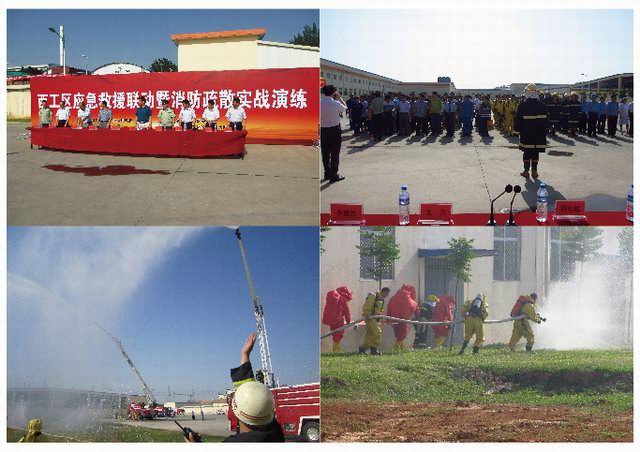 洛陽(yáng)市安監(jiān)局領(lǐng)導(dǎo)、洛陽(yáng)市消防支隊(duì)領(lǐng)導(dǎo)、區(qū)領(lǐng)導(dǎo)迅速趕赴現(xiàn)場(chǎng)指揮救援,8臺(tái)消防車(chē)、2臺(tái)救護(hù)車(chē)在公安交警車(chē)開(kāi)道下呼嘯而至,120名消氣防戰(zhàn)斗員訓(xùn)練有素展開(kāi)救援,生產(chǎn)調(diào)整組、安全環(huán)保組、警戒保衛(wèi)組、設(shè)備搶修組、信息管理組共50人分別按預(yù)案井然有序開(kāi)展現(xiàn)場(chǎng)工作。由于反應(yīng)迅速,處置得當(dāng),沒(méi)有造成周?chē)w、空氣環(huán)境污染,沒(méi)有發(fā)生其他次生事故,1名中毒的現(xiàn)場(chǎng)操作人員得到及時(shí)救治。本次演練為力求貼近實(shí)戰(zhàn),對(duì)突發(fā)事故應(yīng)急處理真正起到指導(dǎo)和演練作用,改變以往演練模式,應(yīng)急指揮部演練中還臨時(shí)增設(shè)了演練科目。